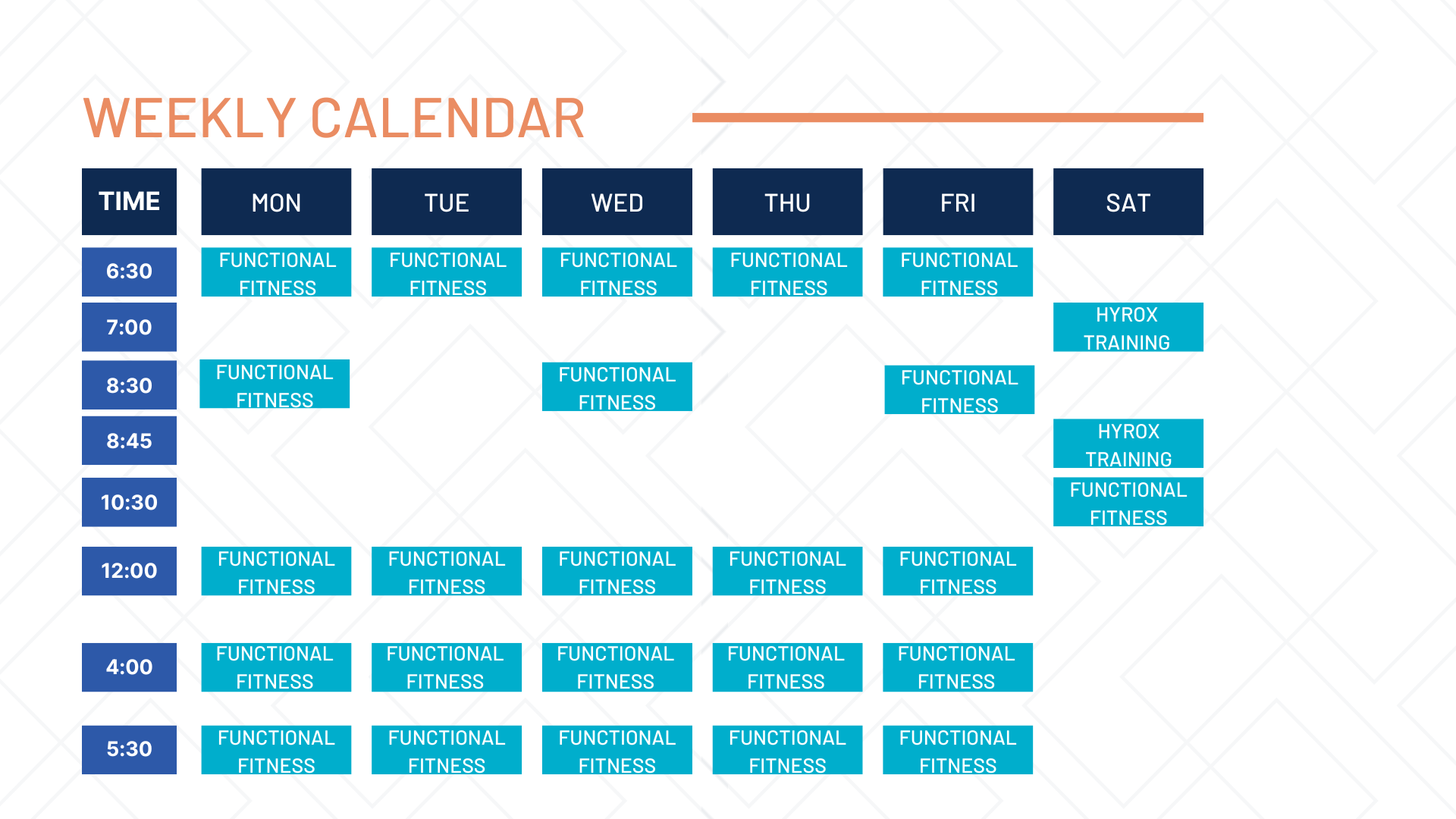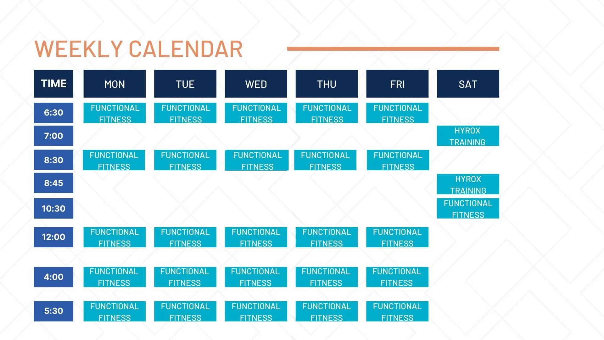 7:00 AM (HYROX), 8:45 AM (HYROX), 10:30 AM (Functional Fitness)